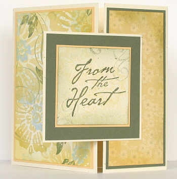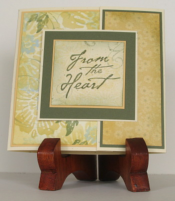 I chose two papers from Le Jardin designer paper pack and matted one with Always Artichoke and the other with So Saffron. Then I sponged and stamped faintly corners of the flourish stamp from Baroque Motifs on a square to create a background for the sentiment “From the Heat”. I triple matted the sentiment square and then attached it to the smaller side panel so that when closed it would be in the centre.