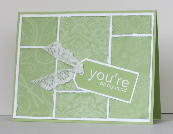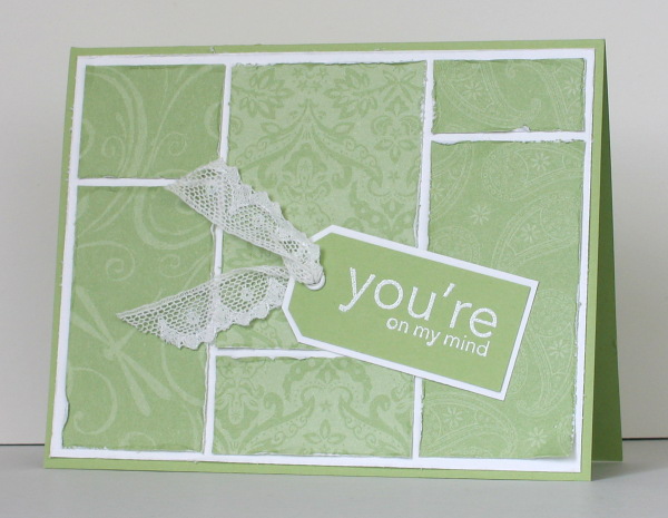 I decided to feature designer paper instead and pulled out the Certainly Celery paper from a year or so back which is covered in pretty designs.  As soon as I did I started thinking of fabric swatches again and ended up with the shabby chic design above.  I distressed the edges of each piece of designer paper and then found a piece of white lace to fit in with the fabric theme.  I stamped the sentiment in versamark and embossed in white before adding a little white eyelet.  The sentiment is from the Upsy Daisy set.
