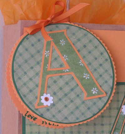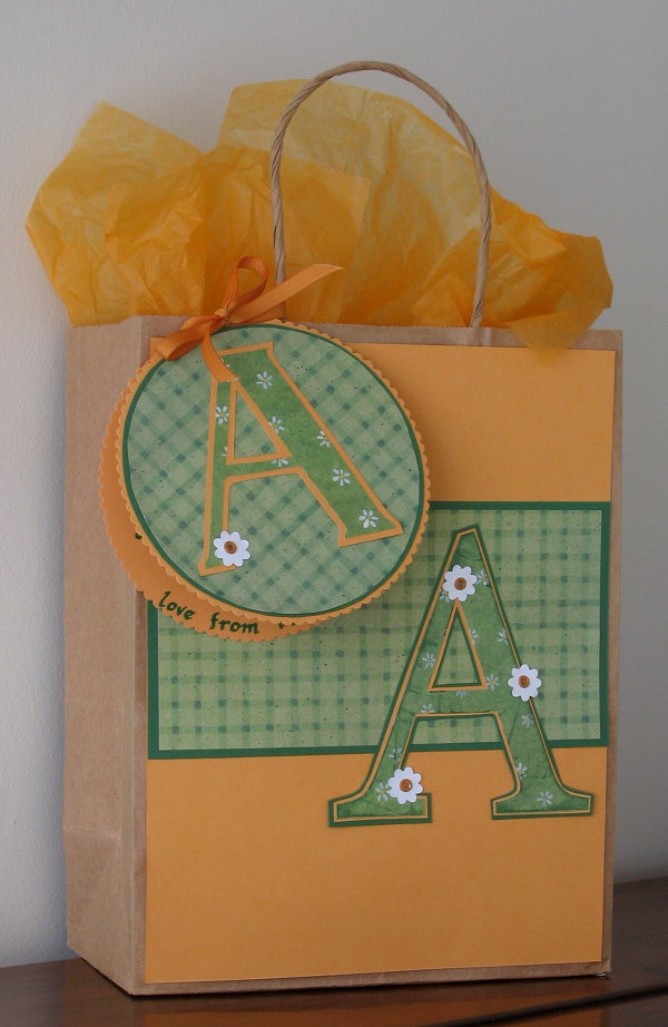 Posted: November 10, 2008 Filed under: Designer Paper, Gifts 1 CommentOn the weekend we helped a very sweet little girl celebrate her 1st birthday. Inside this bag was a dress from my favourite clothing store, La Cache, which is closing down. I took the colours for the bag and card from the dress which is green, yellow and burgandy. I don’t own any nifty Nestabilities or circle cutters so don’t look too closely at the circle traced from a cd! The golden colour is Marigold Morning and the green, Garden Green. Both patterned papers are from a slab bought long ago at Michaels. The ‘A’ on the bag is stamped with the large monogram ‘A’ from Stampin’ Up. I inked the edges of the stamp in green and then stamped it on the floral paper to get a outline to cut out. The ‘A’ on the card was hand drawn. The little flowers are punched out with the Boho Blossoms punch.