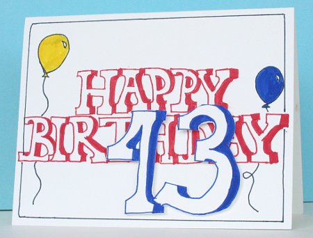 I gave my almost thirteen year-old girl the task of making a card for a thirteen year-old friend with whom we celebrated on Sunday. It was hard coming up with an appropriate gift let alone a card. My stamp collection does not have much in the way of “boy stamps”. Miss A rose to the occasion and did a hand drawn card. It is not obvious in the photo but the “13” is cut out and popped up. She used Whisper White cardstock and Bold Bright markers.