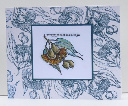 After I had finished the colouring I wasn’t sure what I wanted in the background and tried several arrangements of blue blossoms before deciding to fill in the entire background.   On one hand it seems a bit busy, on the other I feel like I just made my own patterned paper.