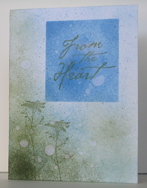 Posted: July 6, 2010 Filed under: Of the Earth Leave a commentThis card came together by accident. I had stamped a small square image and embossed it so I could sponge in some colour after the embossing. Once I had done that I decided to mask an area on the card base to make a frame; that is the blue square you see on the card. When I positioned the square image on the blue sponged area it did not look any good so I just started experimenting, adding sponging all over the card. I added some artichoke sponging and some ink splatters and it began to look like I could make something out of it. I added the flowers and then did some spattering with water which disperses the ink creating little watermarks. The watermarks are my favourite part of the card. I added a sentiment and ended up quite happy with the card which was nothing like what I had imagined. If you click on the image you can see the watermark effect more clearly.