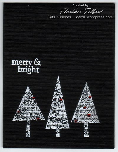 The OLW challenge this week is hosted by Jennifer Styles and asks us to make a black, white and red card.  I don’t think I have ever made a black Christmas card; it’s not really a traditional Christmas colour, but at least the snow is white.  The black textured cardstock was just sitting there on the table and I do love textured card so I thought, why not?  I guess what I have here are snow covered trees in the dead of night, lit by some unknown source of light!