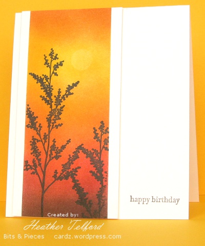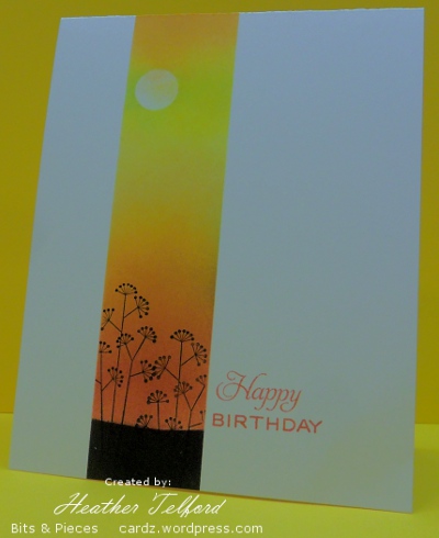 Heather, what a great analysis of your two cards! I quite liked the first one, but as I read your paragraph about it, I agreed with every point. And I DO think the second one is perfect! I like seeing more of the color on the card, in particular, and the shading to dark at the bottom instead of the bold dark of the first one. Would the first one have been more visually pleasing if you let the stamp go into the white areas on either side of the strip of color? I don’t know, but I can very safely say I’d have love receiving either card in the mail! Both are beautiful.