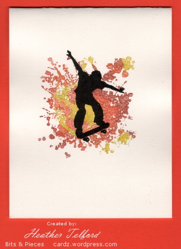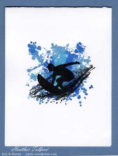 I was a bit stumped until I remembered these stamps from the Extreme collection.  I coloured directly onto the splat image with markers then misted it before stamping on the card front.  The surfer and the skater are both embossed in black.