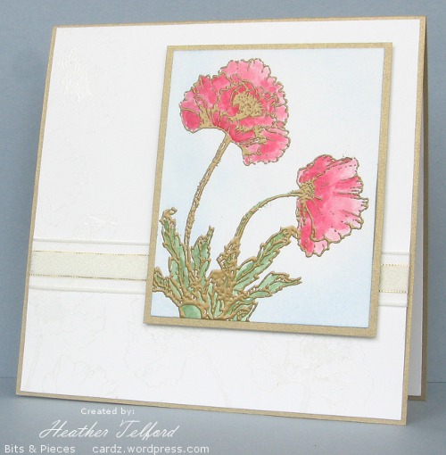 It was quite a departure for me to make a card like this after making so many one layer cards lately.  I embossed the poppies in gold, coloured with SU ink and an aqua painter, then sponged the pale blue background.  It is not really visible (perhaps my new camera might have captured it better??) but I also embossed poppies in white around the left-hand and bottom edge of the large white panel.