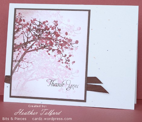 I inked the stamp with cherry cobbler and then inked the branches on the stamp with early espresso.  By stamping once and then stamping again twice more without re-inking I created a shadowy effect.  I added a little fold of riboon too as it needed something extra but not much more.