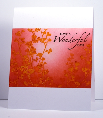I masked, embossed the orange heart branches in clear and then sponged in a light and a dark pink and added a few more orange branches.