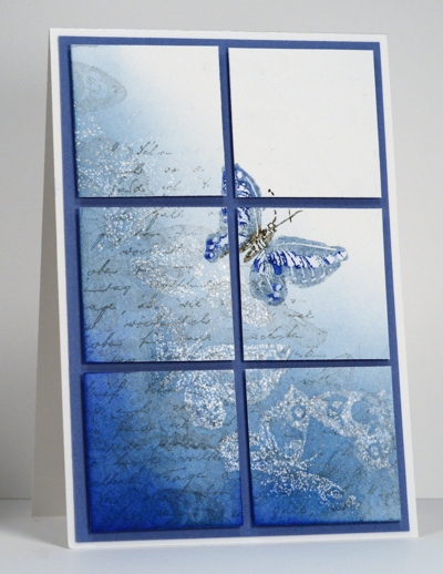 This is a card I made a while ago but never posted so I had to think hard to remember the process I used to make it.  I started with a rectangular panel probably with no intention of chopping it up but you know how these things develop. There are some shadowy butterflies crossing the panel which were embossed in clear first and some grey butterflies under all the sponging also. The sponging was done in a grey blue and a brilliant blue and the Letter Background stamped in grey. I inked the main butterfly with markers. After slicing the panel into squares I popped them up on a blue panel and trimmed the white card base to fit; it is a little thinner than a regular card size.