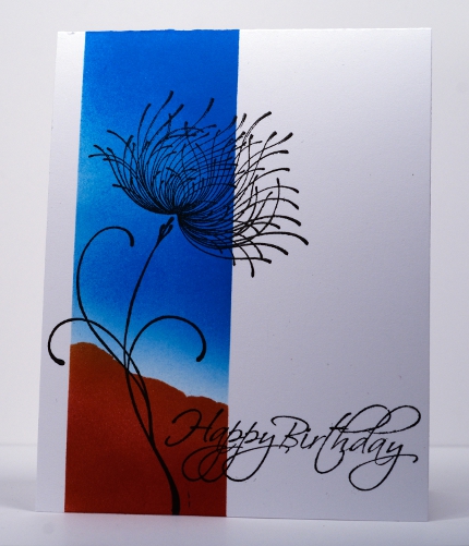 The Penny Black blog ends its technique week with cards featuring masking. I decided to use one of the layouts I often turn to, a masked and sponged vertical panel with a feature image extending beyond the masking. Here are a few other cards I have created using this layout Balloons, Delicate florals & Winter Sky. To create this card I sponged the sky first taking care to get lighter towards the bottom so that I could position a torn mask over most of the sky and sponge a hill in brown.