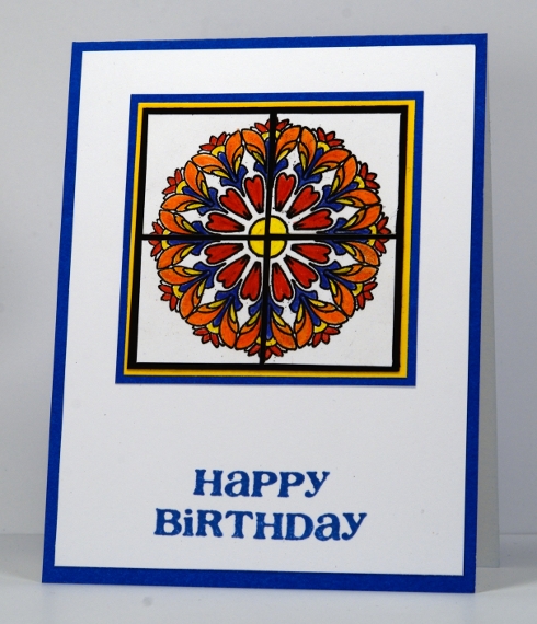Just as yesterday’s “vintage style” card was slightly out of character for me, I think this one is even more so. It is not often you see a primary coloured card or a geometric matted layout from me. But what can I say? Sometimes you just have to try something different. I stamped the medallion in black and embossed it then coloured with watercolour pencils. I added water with a paintbrush to some colours for extra vibrancy. The sentiment is also from Round and Round.