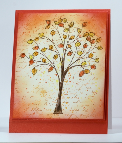 Posted: October 2, 2012 Filed under: Autumn Tree, Penny Black | Tags: arts 10 CommentsI took a slightly whimsical path with this tree and the panel came together by trial and error. I started by embossing the tree and colouring all the leaves and trunk with watercolour pencils. After blending all the pencil colouring with water the tree looked very alone so I started flicking orange, red and yellow water colour paint on the panel with a paintbrush. Flicking led to sponging and then sponging led to some letter background and the tree looked much happier. I chose not to add a sentiment as I haven’t decided on a purpose for this card yet. Could be a Thanksgiving card or maybe a fall birthday. The tree panel is matted in Penny Black Mix&Match ‘fall festival’ cardstock and popped up on a card base of the same colour.