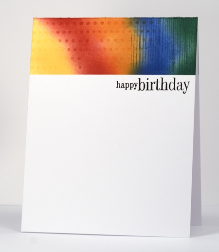 I applied the inks to the stamp just by inking a patch at a time, overlapping a bit with each colour. When I had stamped both the stripe stamp and the dots stamp I used sponges to sponge the same inks over each the corresponding colour of stamping on the cardbase. Hope that makes sense.