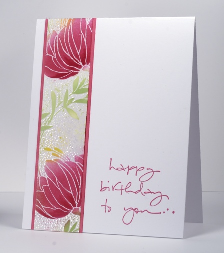 I played around with the large panel and a green mat, eventually deciding to slice the panel into three pieces to try and make it look a bit like a Chinese screen. The three panels were still too much for my clean and simple ways so I tried a single panel per card ending up with the two you see here. I didn’t have quite the right pink card stock to mat the card below so I used a lighter pink and sponged the edges with Rose bud ink.