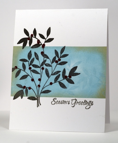 I chose this colour combo along with the new wood mounted stamp, “Christmas Reds and Greens”. I stamped and embossed the branch in smokey grey then masked top and bottom so I could create an aqua background panel. The panel is sponged and stamped with Versamagic Sea Breeze & Sahara Sand. To add the rusty red colour I punched tiny dots from glossy card to be the berries on the branch.