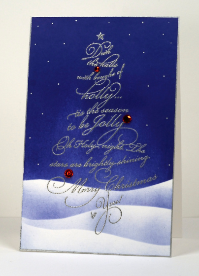 To create the blue and silver card above I began by embossing the “Caroling Tree” in silver embossing powder, next I positioned a mask cut from a post-it note to cover the bottom of the panel. I brayered Memento Paris Dusk ink over the exposed part of the panel then evened out the colour with a sponge. I removed the first mask and cut another to place a little lower then sponged above it to create a snow bank and then another below that. To complete the panel I drew a border of silver with a sharpie and added a few silver stars also. The final touch was a few red rhinestones. I trimmed the card base to fit the panel so it is 5.5″ x 3.5″.