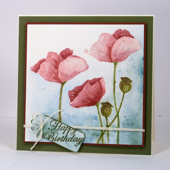 Posted: March 9, 2015 | Author: Heather | Filed under: Blooming tags, Sprigs | Tags: Faber-Castell Albrecht Durer Watercolour pencils, Penny Black creative dies, Penny Black stamps |18 CommentsLast week I posted several loosely watercoloured cards. The poppies on today’s card were painted with more precision and there was no spritzing to make the colours blend and bleed. I worked on a watercolour block which I had splattered with a fine mist of masking fluid. The end result with such a fine mist could represent snow but I think it could pass for rain too. I have had snow fall on my daffodils and tulips but the poppies are pretty safe! Once the masking fluid was dry I inked the poppy image from ‘blooming garden‘ with memento angel pink and new sprout markers. The colours are fairly pale so I had an outline to work with but not so dark that it would be noticeable after I had added all the colour. For this one I used my watercolour pencils as paints. I do this by picking up colour from the lead of the pencil with a waterbrush then painting with it. For the poppies I used colour from three pink pencils (listed below), for the stems and seed heads two greens and a brown then a blue and a green for the background.
