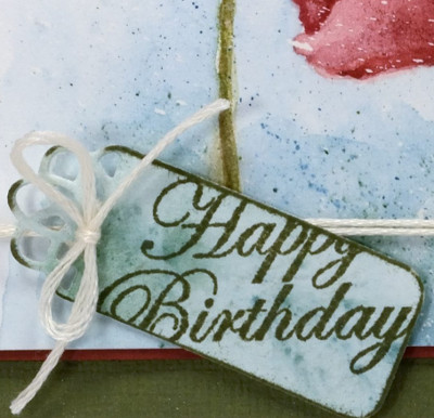 To create the little tag I painted a scrap of watercolour paper with the same colours I had used on the background of the main panel, die cut a ‘flower tag’, then stamped the sentiment from the ‘sprigs’ set across it. To complete the card I matted the panel with a narrow red mat, tied the tag on with embroidery floss, popped the panel up on a wider green mat and attached it to a cream card base.