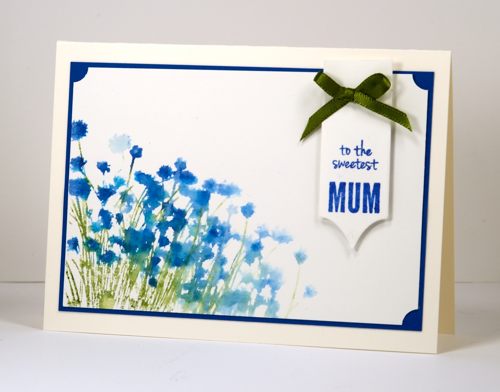 Celebratory cards continue to be the feature over on the Penny Black blog. These week the design team has created cards for Mom or Mum as I would spell it. I was pleased to see that a ‘Mum’ stamp included in the new mini set ‘The Sweetest’. To create my clean and simple card I inked the little floral corner stamp with memento markers, spritzed it with water and stamped on watercolour paper. I spritzed the stamp again without re-inking to get a paler image to the right of the first impression.