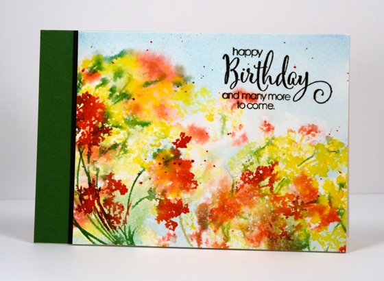 Posted: May 27, 2015 Filed under: Gentle Breeze | Tags: Penny Black stamps, Ranger Distress stains 10 CommentsThis week I am sharing projects featuring new products from the new Sunshine and Smiles collection. Today’s card features the ‘Gentle Breeze’ stamp I used with tags recently. For a change I stamped on cold pressed watercolour paper which has more texture to it. My piece of watercolour paper already had some fine splatters of masking fluid on it. I inked the stamp with distress stains, spritzed it, stamped once, spritzed again and stamped a second paler image. I then spritzed the paper which caused the colour to bleed even more into the background. When it was dry I stamped the image again creating a more defined image in the foreground. I used a marker to ink a few stems and stamped them over the blooms. When all was dry I flicked a few splatters here and there in red and green.