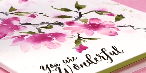 Penny Black has added more lovely brushstroke stamps to their collection including this beauty, Magnolia Rhapsody. I have several techniques I use with my brushstroke stamps; for this card I used memento markers, blending colour both on the stamp and on the paper. Using a stamp positioner I started by stamping the whole image in angel pink memento ink; this gave me a reference image which helped me apply the darker inks in the right places on the stamp. Next I inked all the petals with an angel pink marker then added lilac posies ink to the flower centres and petal tips. I spritzed lightly before stamping so the colour would mix a little then blended further on the paper with a damp brush. After finishing the petals I inked and stamped the leaves, then the branch and twigs.