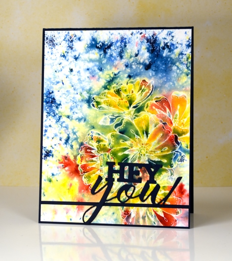 Posted: March 13, 2017 Filed under: Brusho, burst of blooms | Tags: Brusho, Penny Black creative dies, Penny Black stamps 8 CommentsDoes this remind you of batik fabric? Having created and purchased batik fabrics over the years that’s what I immediately thought of when I finished this panel. There were a few techinques in play to get this effect. Maybe you find it a little messy, or maybe bright and happy. The main technique is emboss resist so I will just mention for any Toronto readers I will be teaching my Watercolour Resist class in Toronto on April 8th, the details are on my Upcoming Classes page.