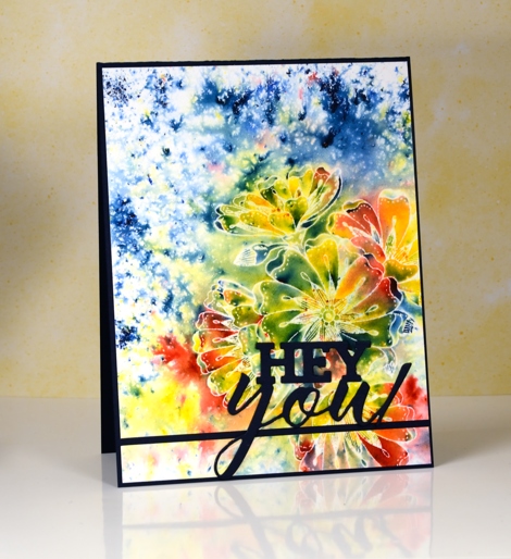 To mimic batik more closely I ironed the panel face down into a few pieces of printer paper to melt and remove the embossing powder but leave the white outlines. I mounted the panel on a navy card base but sliced a section off at the bottom to split the panel and make a line for the die cut sentiment to sit on. I haven’t used this card yet but I can make it a birthday, graduation or just hello card by adding the right words inside.