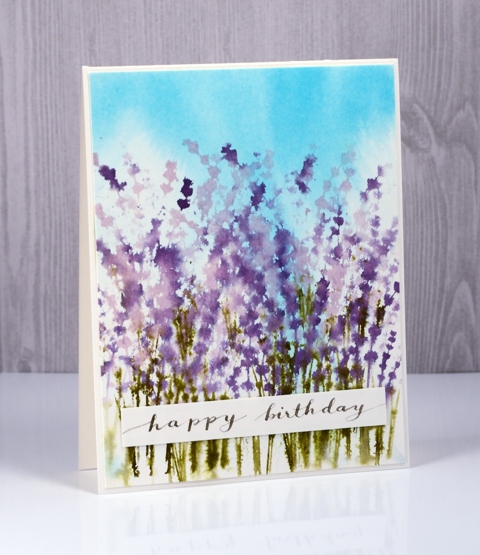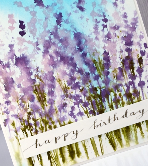 Once the sky was dry I inked only the tops of the flower stalks in milled lavender stain, added a few dabs of dusty concord and stamped half way up the panel. I inked again and stamped further down, then to fill the bottom of the panel I inked with the purples and green on the stems. I spritzed both the stamp and the paper lightly before stamping.