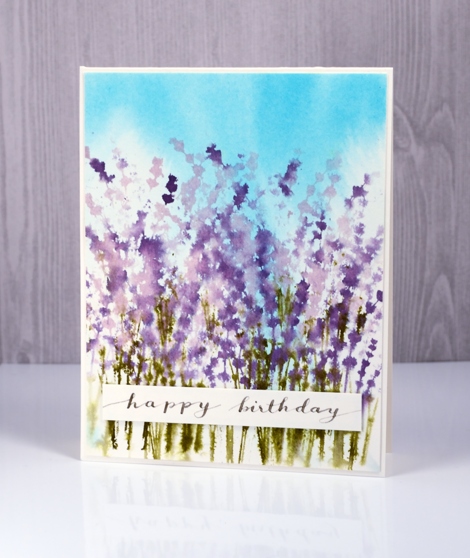 Wildflowers again today because I love the way this stamp creates such a pretty image when wet and blurred. I left the blue out of the mix this time and stuck with purples. Before stamping the flowers I painted a pale sky on my watercolour panel by adding broken china distress stain to one end of a piece of wet hot pressed watercolour paper then tilting it so the colour drained down into the panel. This technique made some areas blue and others pale like clouds.