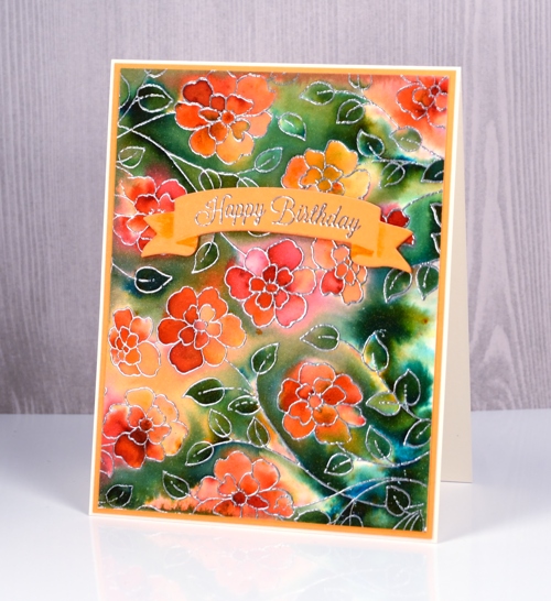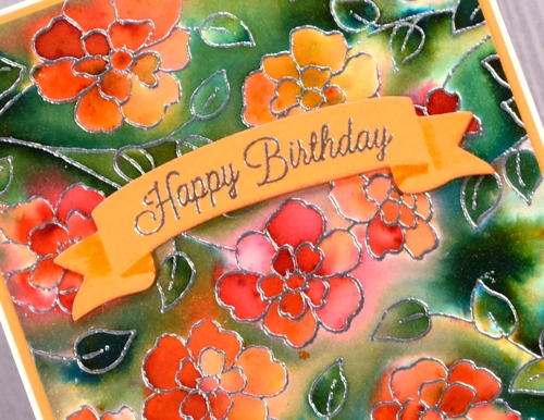 I let the panel dry naturally then trimmed it and matted with orange cardstock. I cut a curved banner from the new set ‘birds & banners‘ and embossed one of the co-ordinating stamps from the ‘banner sentiments‘ set in silver. The die cut banner looks folded so I used a marker to add a little shadow to the areas which appear to be behind the main section. I cut the same banner from orange fun foam so I could pop my sentiment up on the floral panel.