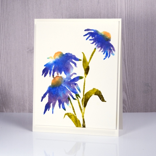 My second attempt is a little different as I used some of the same colour stsains but also pulled out my pearlescent finetec paints and painted some directly on the stamp and the panel, blue on the petals, green on the leaves and gold on the flower centres. It is hard to see in the photo but there is definitely some shimmer happening.