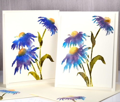 Two gorgeous cards and envelopes Heather and both colour blues are so vibrant and pretty, and it doesn’t matter at all that you would never see daises this colour as the blue tones with the complementary yellow centres are stunning. x