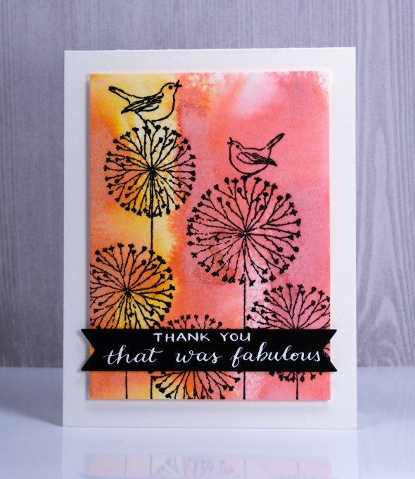 You need to get your handwriting made into stamps. I love the way the way the background colors blend so perfectly. I don’t have this stamp. but know any silhouette stamp would look stunning on the “sunset-ty” background.