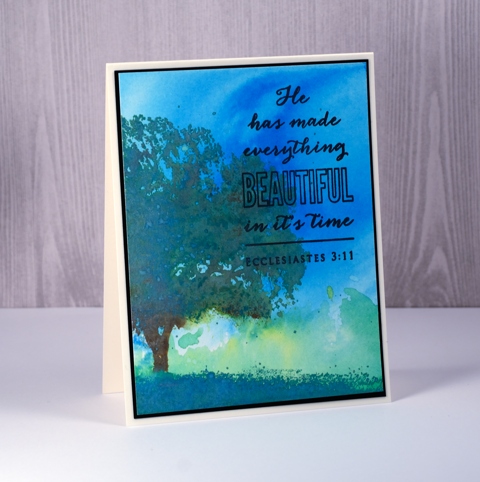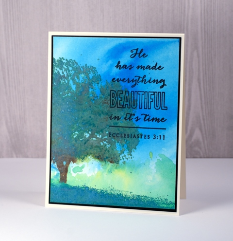 Only the grass remained to be stamped so I picked ‘lucky clover’ on account of its name and stamped that across the bottom of the panel. I kept the stamp in place but moved my paper to extend the grass from one side to the other. The overall effect is more like a tree painted in acrylic over a watercolour sky. Rather than switch to my usual versafine for the sentiment I kept it all in the DiOx family and used black soot then framed the panel in black and attached it to my cream card base.