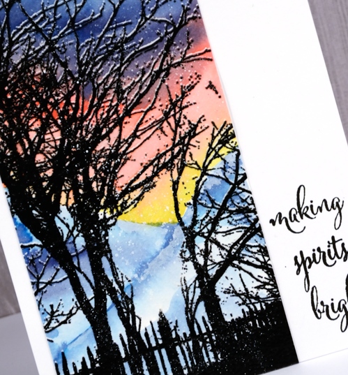 If you take a close look you can see the branches have a thin white line above the black silhouette. I created that layer of snow by stamping the ‘peaceful moments’ stamp once in versamark ink (which is clear) then I move my watercolour paper panel up ever-so-slightly (no more than 1mm) and stamped it again in versafine onyx black. With the image stamped twice I then embossed in clear powder so both the clear and the black inking would resist watercolour paint when added over the top.