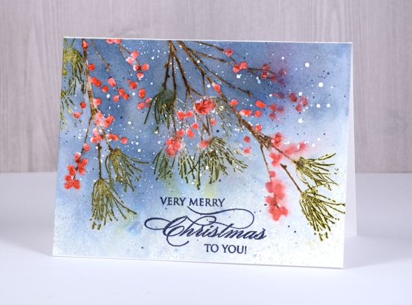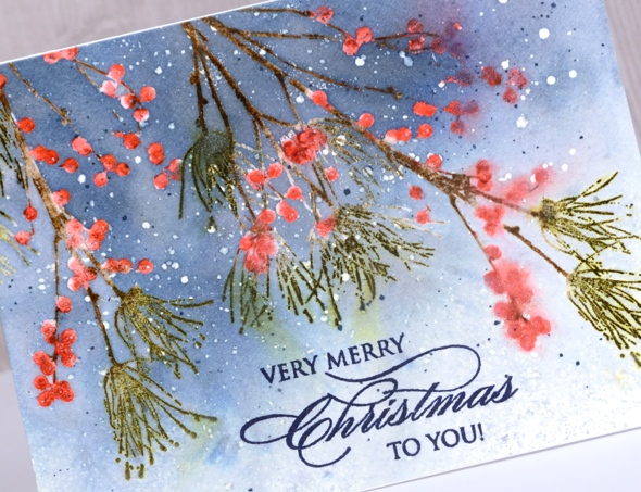 I am happy to be sharing this card over on The Foiled Fox blog today. I used a combination of distress markers to colour the berry branches first then, once they were dry, I clear embossed over the top so they would resist the masking fluid I splattered and the sky I painted next. The process is described in detail over on the Foiled Fox blog so pop over and check it out.