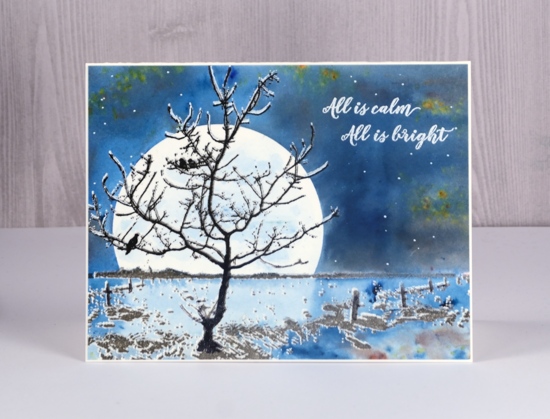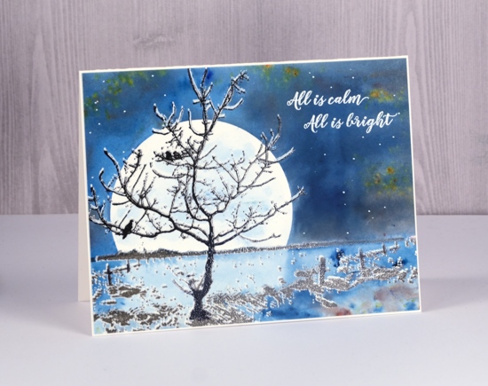 As with the previous two projects I used hot pressed watercolour paper. I placed the panel in my stamp positioner 1mm from the top edge then stamped the ‘restful’ stamp in versamark ink. Next I moved the panel up so it was flush against the top edge of the stamp positioner and stamped the tree in versafine onyx black and the rest of the stamp in versafine smokey grey. I then embossed the panel in clear powder. By moving the panel just 1mm up between the two impressions I was able to create the look of snow on top of the branches and fences and uneven ground.