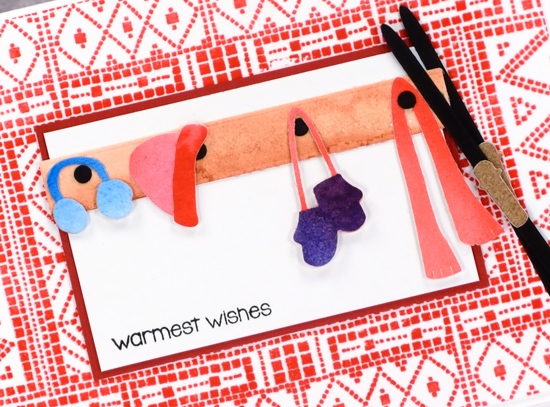 I had some fun and a certain amount of frustration putting today’s cards together. The fiddliness factor was high, well for me anyway. All three cards feature the winter wardrobe and sled ‘n’ skies die sets from Penny Black. I’ve backed them with the mosaic pattern stamp on the first two cards and created an outside window backdrop for the final card.