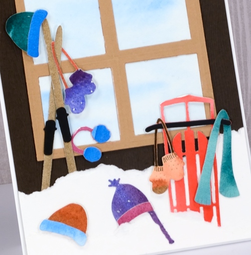 To create my outdoor scene I used a piece of brown wood textured cardstock then tore some white card to create two layers of snow where I tucked in the sled, skis and hats (or beanies and toques depending where you come from!) I painted pale blue on a white piece of watercolour paper for the window panel and die cut a light brown square with four more squares cut from it for the window frame.