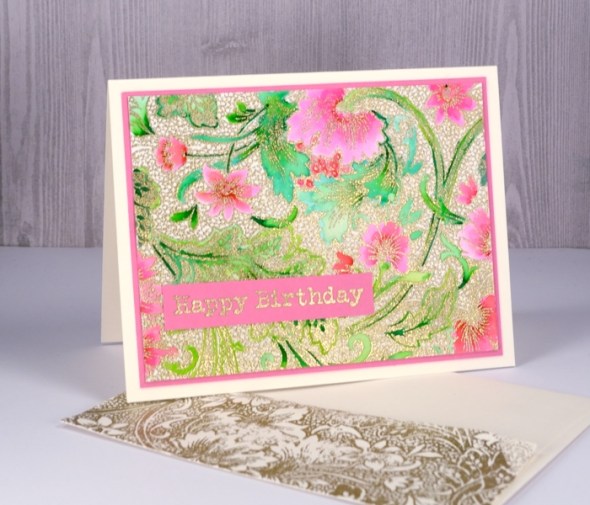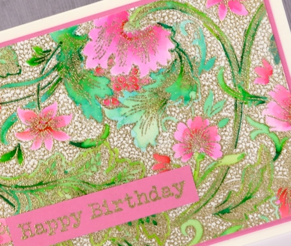 Posted: January 20, 2018 Filed under: Flower garden | Tags: Darkroom Door stamps, sakura Koi watercolor brush pens, WOW embossing powders 10 CommentsThe ‘flower garden’ stamp from Darkroom Door performed so well with the random application of colorburst paint I tried it with a more controlled colouring method. I embossed this panel in gold then used Koi colouring brush pens. I decided to colour only the leaves and flowers and leave the tiny circle pattern filler uncoloured. Adding colour to gold embossing like this reminds me very much of Cloisonné which I saw on little trinkets as well as substantial, beautiful vases in China. I used two greens, a pink and a red to colour the design and kept blending with water to create soft gradation of colour.