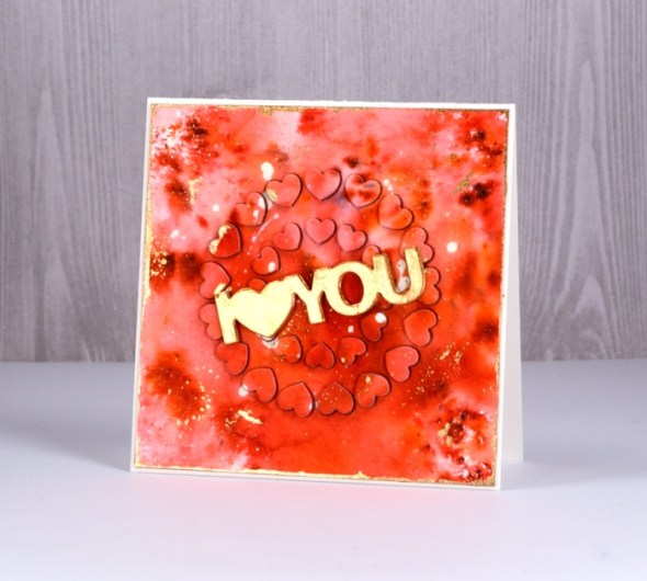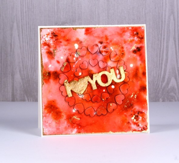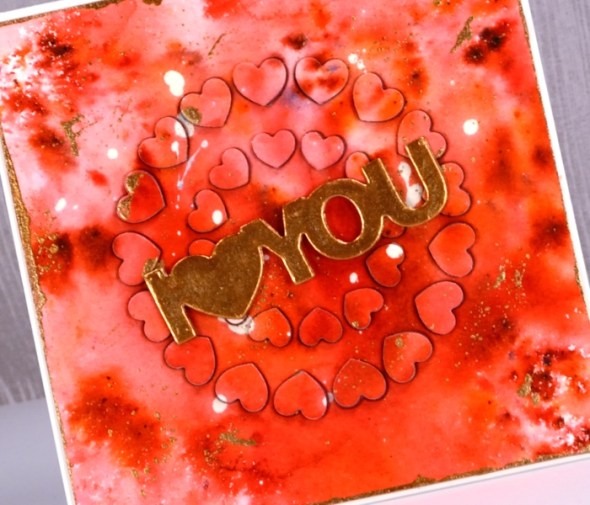Finally I die cut two sentiments from the ‘filled with love’ set out of watercolor paper, glued them together and painted them gold. I attached them over the heart circle so the card is somewhat bulky but nothing a little extra postage or a hand delivery can’t handle.