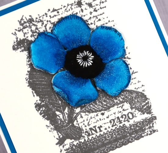 I completely agree with Pat. One minute I prefer the vintage look, and then I am taken by the metallic blue bloom. One stamp, two little masterpieces. Well done you!