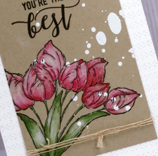 I stamped the Penny Black ‘tulip bouquet’ stamp in the corner and part of a sentiment from the PB ‘choose happy’ set both in versafine onyx black ink then started colouring. Since I began teaching my pencil colouring technique class I have had pencils within reach most of the time. I grabbed a couple of prismacolor pinks, a green and a polychromos white to colour the tulips and leaves. The antique hemp twine seems to be popping up on quite a few cards too; it’s not too thick to knot or tie in a bow and it blends in with most colour schemes and especially kraft cardstock. To add a little interest to my white card base I gave it an all-over texture treatment by running it through the die-cutting machine several times with the new ‘rows of stitches’ die from Penny Black.