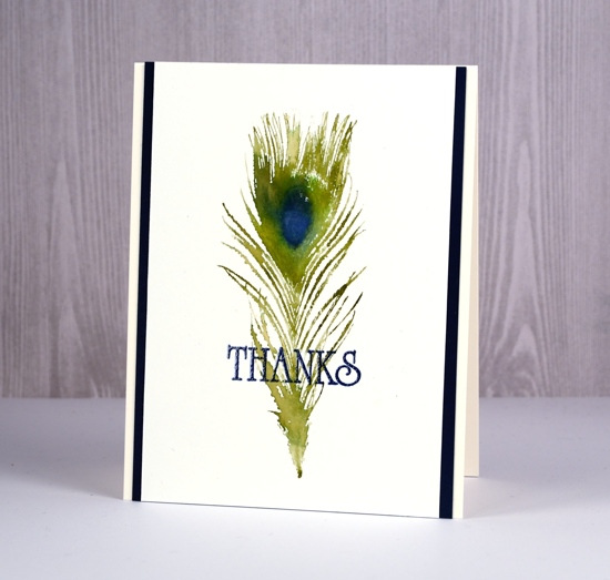 Posted: February 27, 2018 Filed under: Botanical Script, Brusho, Feathers | Tags: Brusho, Darkroom Door stamps, Koi coloring brush pens, Kuretake Zig clean color real brush markers, Tsukineko Versafine inks, WOW embossing powders 4 CommentsI decided to try a couple of methods for colouring a peacock feather stamp, my first experiment with the ‘Feathers’ set from Darkroom Door. I look forward to trying all of them eventually but the gorgeous colours of the peacock feather prompted me to pick that one first.The colouring on this first card was zig clean colour real brush markers directly on the stamp. I used the stamping platform so I could add one colour at a time. I blended the centre a little with a brush to get solid colour then spritzed the stamp with interference gold pearl-ex spray and stamped over the marker image. This gave everything a little shimmer and blended the colours into each other a bit. My pearl-ex spray is homemade; I add a small amount (about 1/8 tsp into a small spritzer filled with water). I stamped ‘thanks’ over the feather with majestic blue versafine then embossed with clear powder. The border panel looks black but is actually blue to co-ordinate with the centre of the feather and the sentiment.