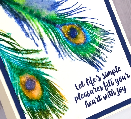 My final colouring method was with Sakura Koi colouring brush pens. I kept the stamp in the stamping platform so I could ink then stamp a colour at a time. The Sakura pens are very bright so I thought they were a good match for the gorgeous colours of peacock feathers.
