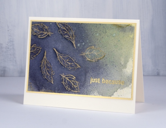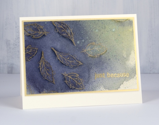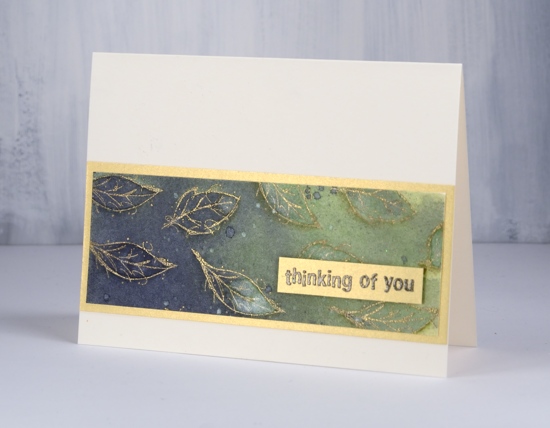 I have a couple more shimmery leafy cards to share today. I created these with leaf stamps from Darkroom Door and Shimmerz spray paints. The panel started out as a square that I intended to turn into a large square card but when it was complete I decided to slice it up!