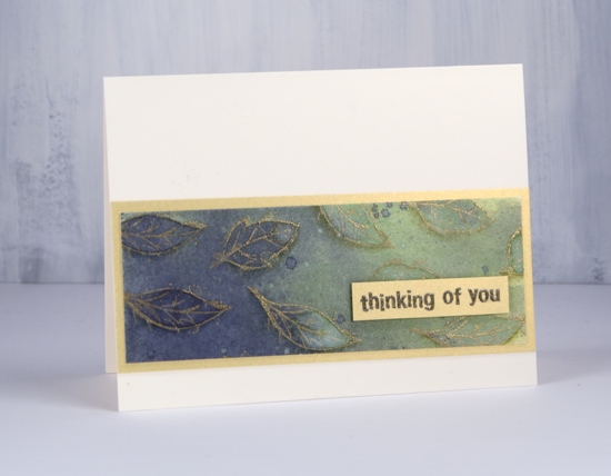 I wanted the leaves to stand out just a tiny bit more so I used a dark blue and an olive green pencil to shade around each leaf so they appear to be lifting slightly off the paper. Once I’d decided to create two cards I matted both panels in gold shimmer cardstock and added embossed sentiments.