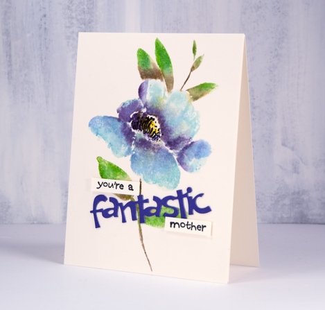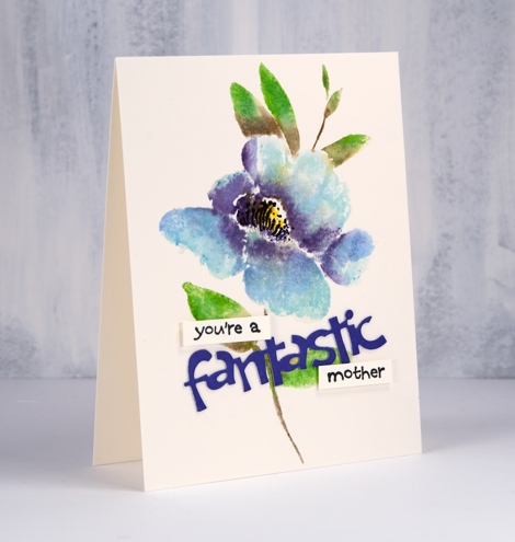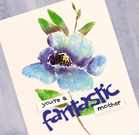 For a sentiment I die-cut ‘fantastic’ twice from purple cardstock backed with double sided adhesive. I stacked the die cuts together and attached them over the stem. I pulled out an older but very handy set called ‘word express’  and stamped a few words in black ink on watercolor paper. I popped them up with adhesive to create an encouraging message for a mother I know.