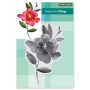 Today I am featuring the new brushstroke stamp, ‘ravishing’. I have chosen to colour it with distress inks and markers in a couple of my favourite colours. Once again I worked in a stamp positioner so I could add one colour at a time. First I inked the petals of ‘ravishing’ stamp with tumbled glass distress ink and stamped. Next I added dusty concord ink to parts of the petals, spritzed them then stamped. The centre I inked with a mustard seed distress marker, spritzed and stamped then finally added some black details on the stamp with a black soot marker. Once all the ink dried I drew some more details on the panel with the black soot marker.