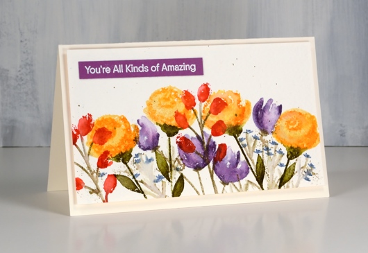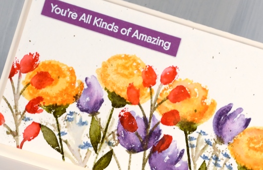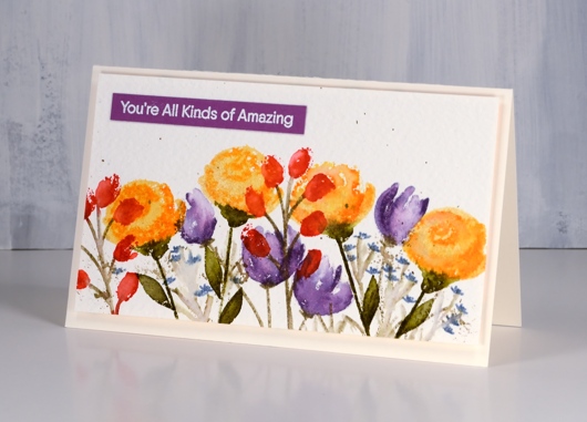 To create this card I worked with a bold red, orange and purple palette on rough watercolour paper with distress ink pads, a little different to the blues, pinks and hot pressed choices I often make. The stamps are from the Painted Prints layering set from My Favorite Things. I started by stamping the roses in scattered straw with the second layer in spiced marmalade. After stamping I blended with a wet paint brush. Next I popped in the purple flowers stamping off with dusty concord for the first layer then using the same ink at full strength for the second layer. The red flowers I used only the second layer stamp with festive berries ink.